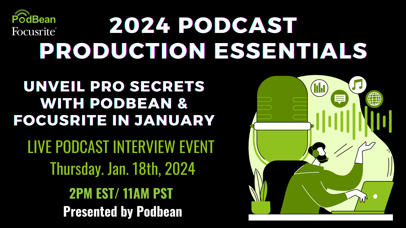 Welcome to an exclusive event brought to you by Podbean, in collaboration with Focusrite, designed to elevate your podcasting game in 2024. This January, dive deep into the world of professional podcast production with insights from industry leaders.   Key Takeaways: • Expert Techniques: Learn directly from Focusrite about advanced audio production techniques to enhance your podcast's sound quality.   • Technology Insights: Discover the latest in audio interface technology, including a detailed walkthrough of Focusrite's Vocaster Two.   • Gear Selection Guidance: Gain valuable insights into choosing the right audio gear for your podcast, tailored to various budgets and levels of expertise.   • Sound Engineering Basics: Explore fundamental sound engineering concepts, including microphone techniques, soundproofing, and audio mixing, to achieve studio-quality recordings.   • Live Demonstrations: Experience hands-on demonstrations of audio equipment, providing practical knowledge you can apply immediately.   • Q&A Sessions: Engage in interactive Q&A segments with Focusrite and Podbean experts, tailored to answer your most pressing podcasting questions.   This event is perfect for podcasters at all levels – whether you're just starting out or looking to refine your production skills. Don't miss this opportunity to start 2024 with the knowledge and tools needed for podcasting success.